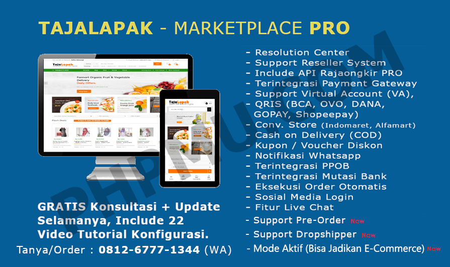 Terintegrasi API WA Gateway, PPOB, Mutasi Bank (BCA, BNI, BRI, Mandiri, Muamalat Mandiri Syariah, BCA API, BCA Giro. BNI Giro, BRI Giro, Mandiri Giro dan Cimb Niaga Corporate), Eksekusi Order Otomatis dengan Transfer Nominal Unik, Sosial Media Login, dan Rajaongkir PRO.